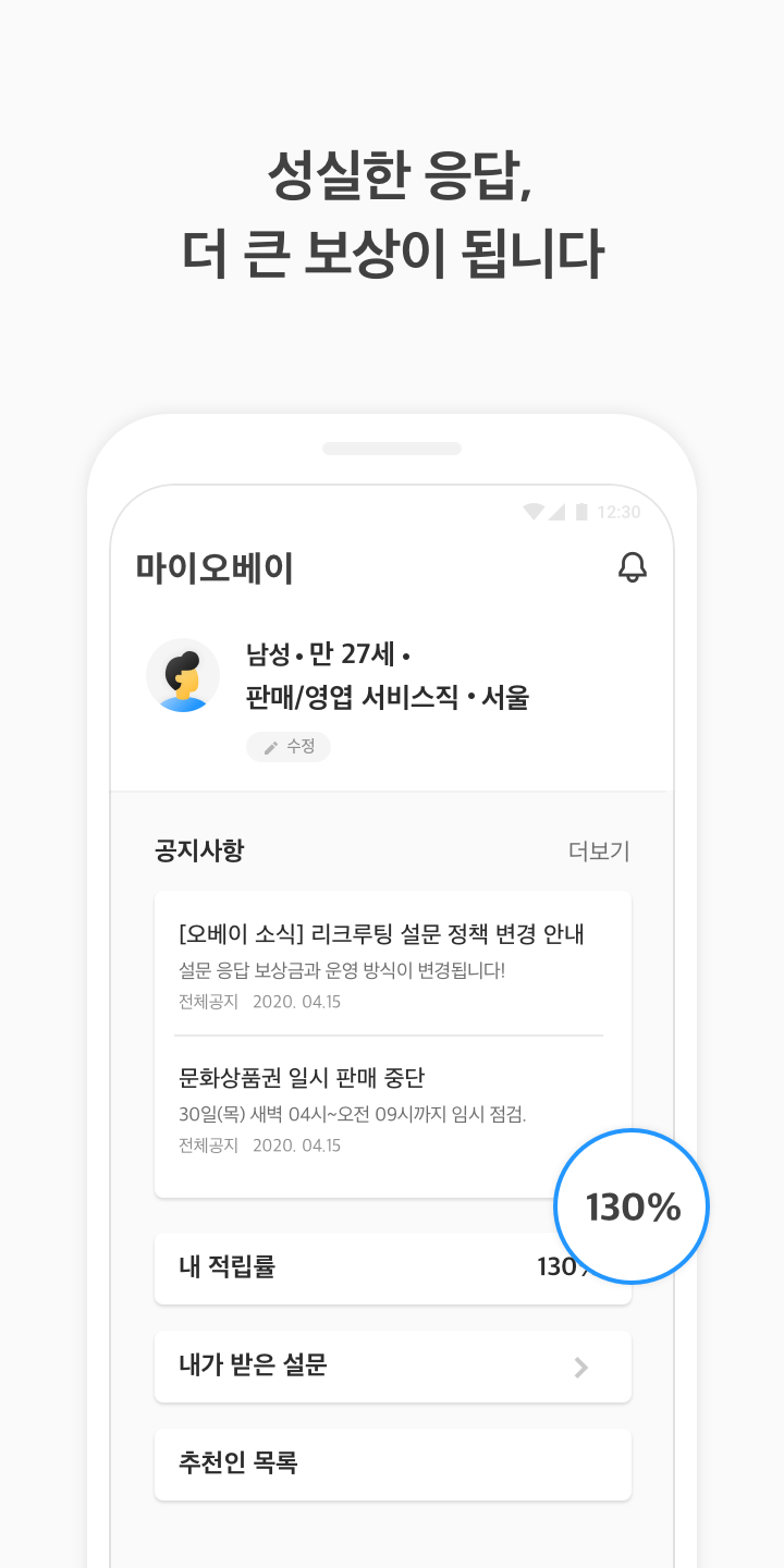 다음으로 소개할 설문조사 앱은 ‘오베이’야! 오베이는 설문조사를 성실하게 응답🧐할수록 리워드가 커지는 설문조사 어플이야. 설문을 통해 적립한 오베이머니로 오베이샵에서 다양한 상품🎁을 구매할 수 있어. 상품은 커피부터 편의점 교환권, 상품권까지 다양해. 또, 오베이머니를 현금으로 바로 교환도 가능하니 필요한 상품으로 바꿔보는 건 어떨까?