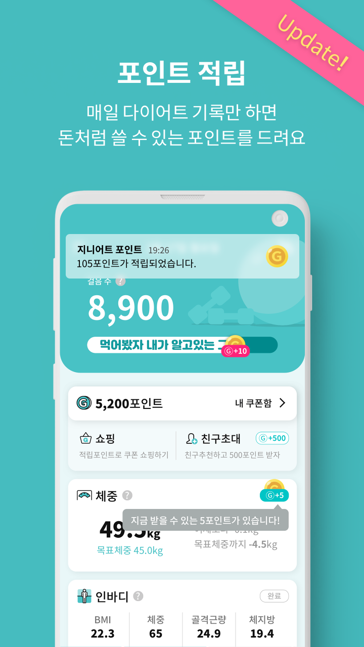 다이어트 중인 친구들은 ‘지니어트’를 주목해 줘! 🐷 지니어트는 리워드를 받으며 의지를 불태울 수 있는 다이어트 어플이야. 체중, 눈바디, 인바디는 물론 물 마시는 습관까지 지니어트에 건강 데이터를 기록하면 하루 최대 110포인트를 받을 수 있대!! 식단🍚을 입력하면 영양소 정보 안내와 함께 하루 최대 90포인트가 지급된다니, 엄청 유용하지? 이번 겨울은 돈 벌면서 몸짱에 도전해보자!
