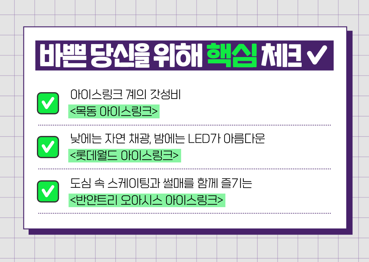 추위에 온몸이 덜덜 떨리는 겨울이지만 웅크리기만 하지 말고 신나게 놀아보는 건 어때? 모든 아이스링크장은 입장 시 장갑이 필수인데 현장에서 구매해도 되고 본인 걸 챙겨가도 좋아! 겨울에는 몸이 얼어 있으니 항상 부상 조심하고, 우리 몸 건강히 만나자. 교바-!💜