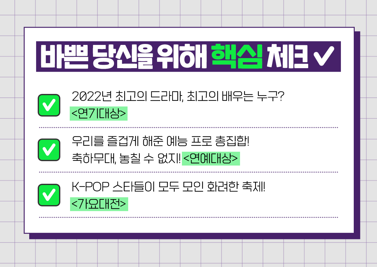 친구들 안녕! 연말이면 한해를 돌아보며 따수운 분위기가 오고 가곤 하잖아.🥰 약속 많은 친구들도 있겠지만, 집에서 시간을 보내길 좋아하는 집콕러들도 있겠지? 연말엔 꼭 챙겨보게 되는 각종 시상식들!🏆 일정부터 출연 라인업까지 교봉이와 함께 살펴볼까?💚