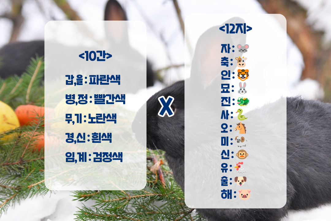 10개의 천간(십간)과 12개의 지지(십이지)를 하나씩 짝지으면👐 60갑자가 만들어져. 매년 '임인년', '계묘년'처럼 이름이 붙는데 정해진 60갑자 순서에 따라 이름이 바뀌는 거지!🖤 흔히 60세가 되면 '회갑'이라고 말하는데, 태어난 해가 한 갑자를 지나 다시 돌아왔다는 의미야. 새해가 되면 올해는 무슨 동물의 해다! 그러잖아? 2022년 임인년은 검은 호랑이의 해라고 하고, 2023년 계묘년은 검은 토끼의 해라고 하고.👀 이게 사실 아무렇게 정해지는 건 아니고 십간의 색, 십이지의 동물이 매칭된 거야.