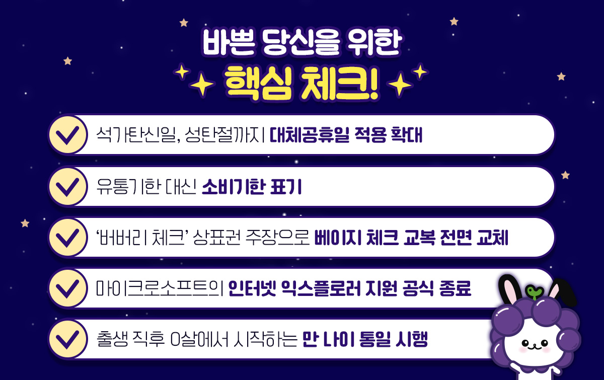 오늘은 2023년 새해를 맞이해 우리 일상에 변화를 가져올 체크 포인트들을 짚어봤는데 친구들에게 도움이 됐으면 좋겠다! 6월부터는 생일에 따라 우리 나이가 1~2살 줄어들 텐데 다들 어려질 준비됐어?!😆 교봉이랑 올해는 더욱 젊고 신나는 한 해 보내보자!🧡