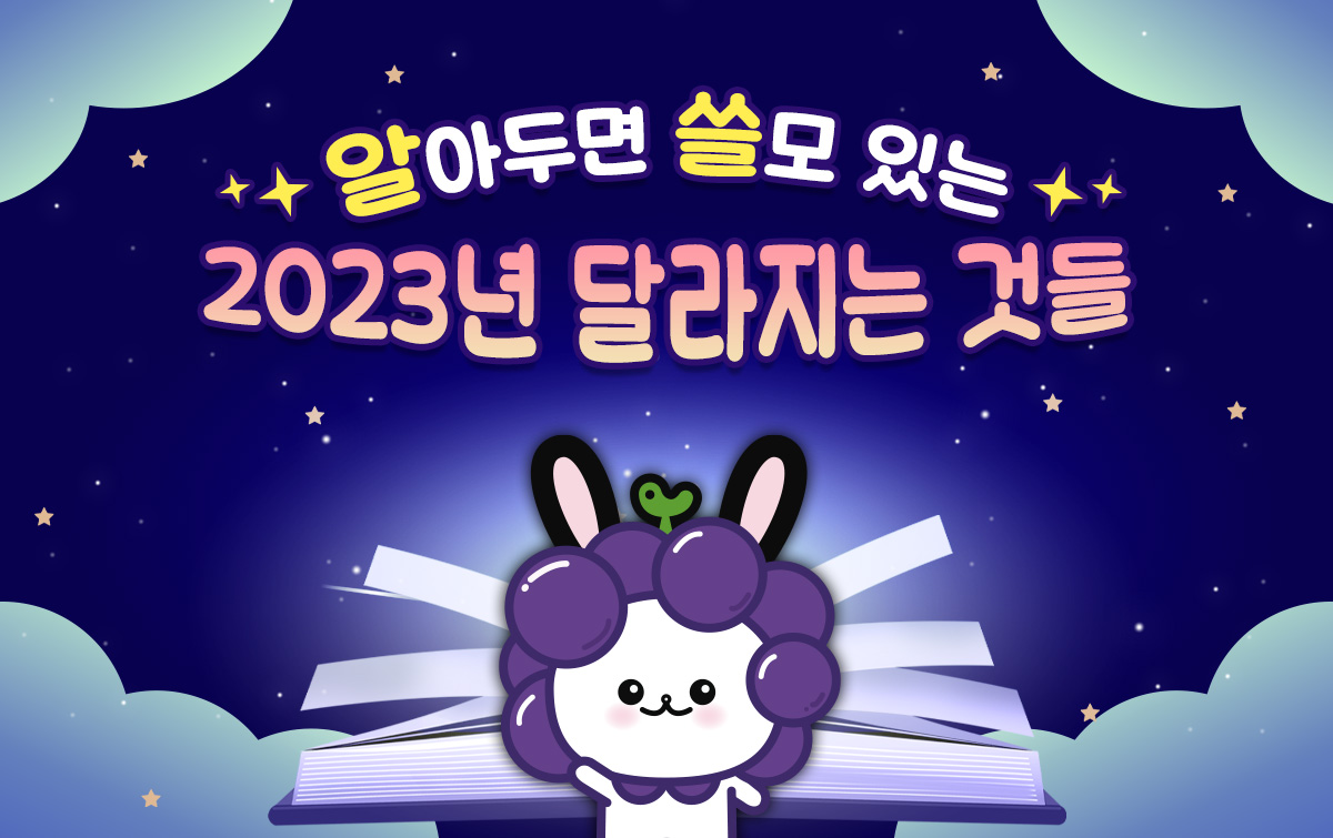 친구들 안녕!? 다들 2023년 새해맞이 멋지게 했어? 올해는 여러 가지 달라지는 제도의 이슈로 우리 일상에도 크고 작은 변화들이 예상되고 있어. 😎오늘 교봉이가 알아두면 쓸모 있는 2023년 달라지는 것들을 알려줄게!