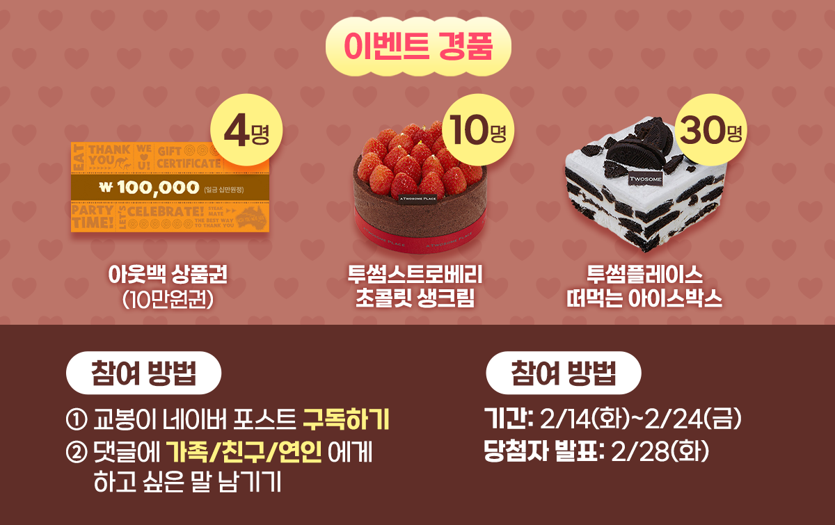 교봉이처럼 친구나 가족, 연인 등 소중한 사람에게 전하고 싶은 말을 댓글로 남겨주면 추첨을 통해 외식상품권, 케익 등 선물할게. 평소 쑥스러워서 전하지 못했던 진심을 전하고 밸런타인데이 선물도 받을 수 있는 절호의 기회!