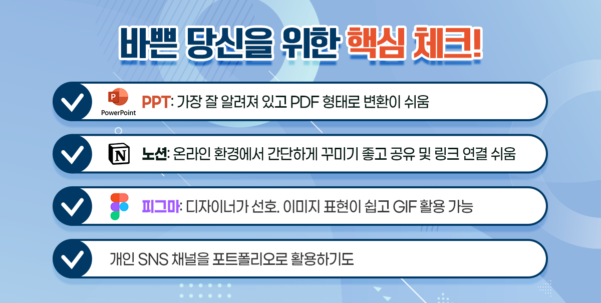 요즘은 블로그나 인스타그램, 유튜브 등 개인 SNS 채널📱을 포트폴리오로 활용하는 친구들도 늘어나고 있어. 잘 운영한 SNS 계정도 스펙의 일부가 된 거지! 선택지가 다양해진 만큼 나의 스킬과 개성을 잘 담아낼 수 있는 형식이 무엇일지 곰곰이 생각🧐해 보는 게 좋겠지?