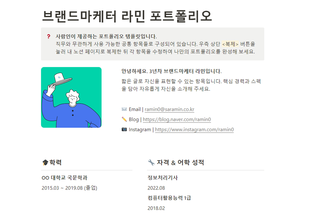 최근에는 아무것도 갖고 다니지 않더라도 간편하게 활용할 수 있는 웹 포트폴리오🖥에 대한 관심이 높아지면서 많은 사람들이 노션을 활용하고 있어. 노션은 퍼스널 브랜딩에 최적화되어 있는 툴인데, 마치 블록을 배치하듯 레이아웃을 손쉽게 조정할 수 있어서 내 개성이 담긴 웹페이지를 금방 만들 수 있지.