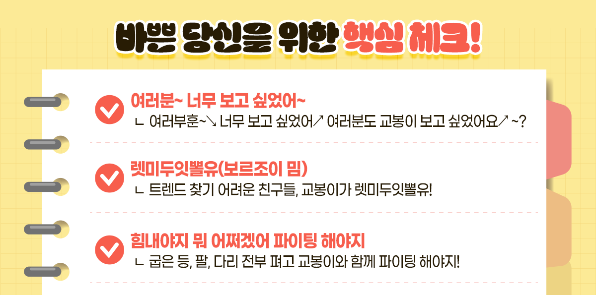 하루가 다르게 쏟아지는 밈과 신조어를 알고 싶은 친구들을 위해 교봉이가 렛미두잇뽈유😎 해봤어. 앞으로도 교봉이가 더 핫한 트렌드를 소개해줄 테니 걱정하지 말고 파이팅 해보자💪🏻!
