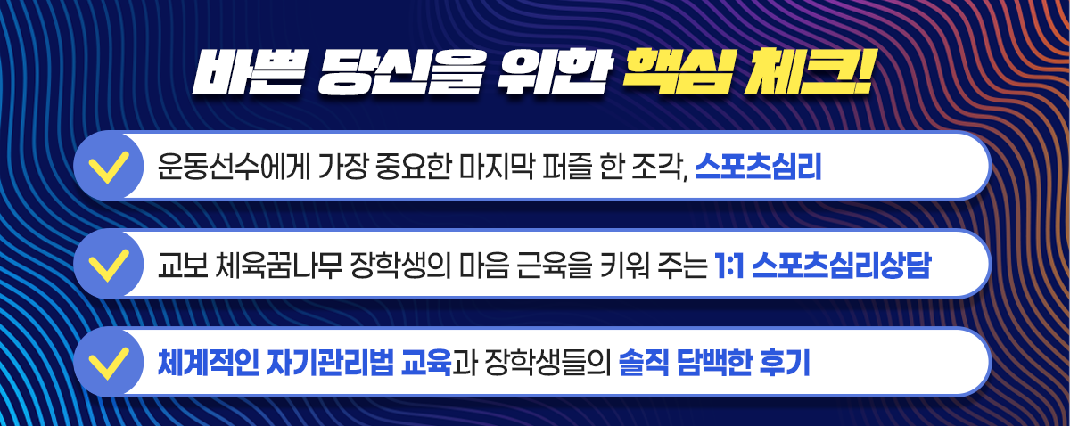 삶에서 어쩌면 가장 중요한 시기를 보내고 있을지 모르는 체육꿈나무 선수들에게, 몸 건강은 물론이고 마음 근육까지 단단히 키울 수 있도록 그 첫걸음을 도와준거지. 한두 번의 상담으로 끝나는 것도 아니고 🙌꾸준히 모니터링하고 교육을 제공해서 이미 1기 장학생 친구들은 그 효과를 체감하고 있대!