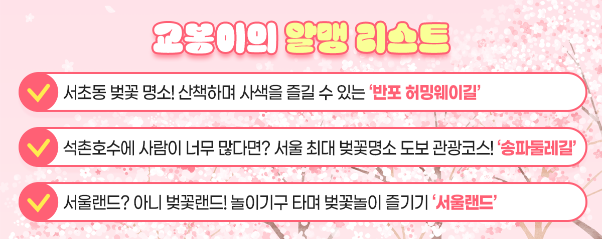 여기서 교봉 꿀팁! 낮에도 밤에도 아름다운 풍경을 자랑하는 반포 허밍웨이길에서 사색을 즐겼다면, 주변 벚꽃 명소도 함께 가보는 것은 어떨까🧐?
