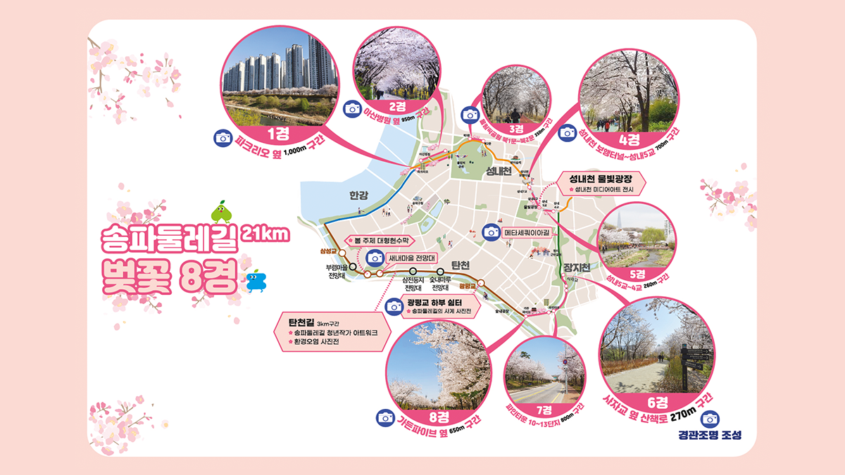 작년에는 송파둘레길을 벚꽃 8경으로 나눠 벚꽃 명소를 안내해주기도 했어. 특히 8경인 가든파이브 옆 제방길은 228그루의 벚나무가 🌸벚꽃 터널🌸을 이루고 있어 벚꽃 나들이를 즐기기 제격!