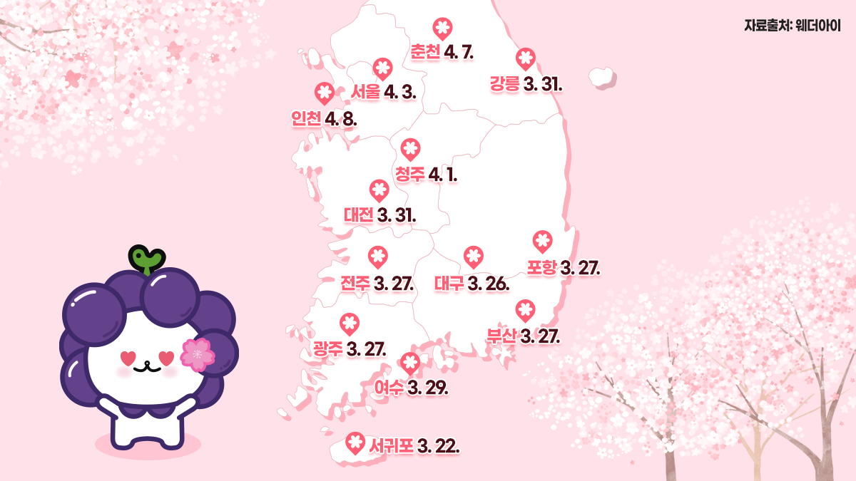 친구들 안녕🖐🏻! 이제 진짜 봄🌷이 온 것 같지 않아? 따뜻한 봄바람에 친구들 옷차림도 한결 가벼워졌더라고~ 이맘때쯤 되면 생각나는 게 있지? 바로 ‘벚꽃🌸’! 특히 올해는 여의도, 석촌호수를 비롯해 코로나19로 제한됐던 전국 벚꽃 축제가 열릴 예정이라 더욱 설레는 것 같아.