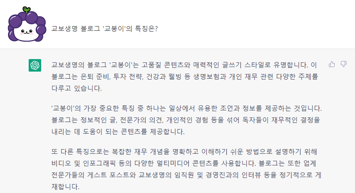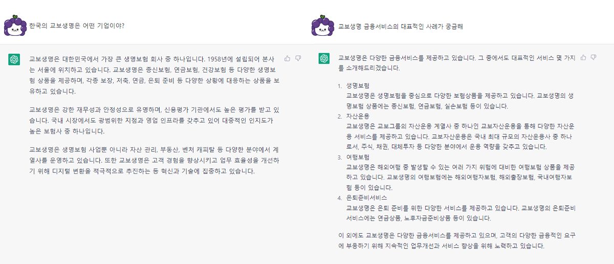 챗GPT에게 ‘교보생명’에 대해 물어봤어. 추가로 궁금한 점을 이어 질문했는데, 깔끔하게 답변해 주더라고😳!