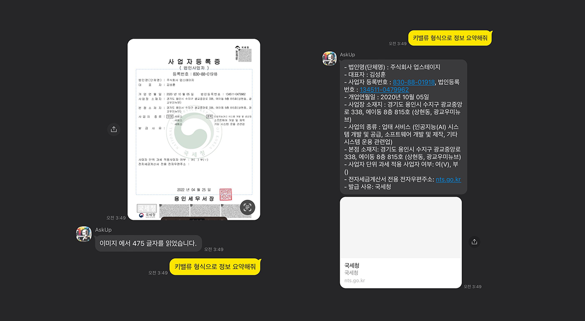 인공지능 전문기업 업스테이지는 눈 달린 챗GPT, 아숙업(AskUp)을 출시했어. 3일 만에 이용자가 3만 명을 돌파하는 등 폭발🌟적인 반응이었는데, 업로드한 사진📷에 적힌 글씨를 인식하고 정리해 준다고 해. 필요한 답변을 얻는 것은 물론이고!