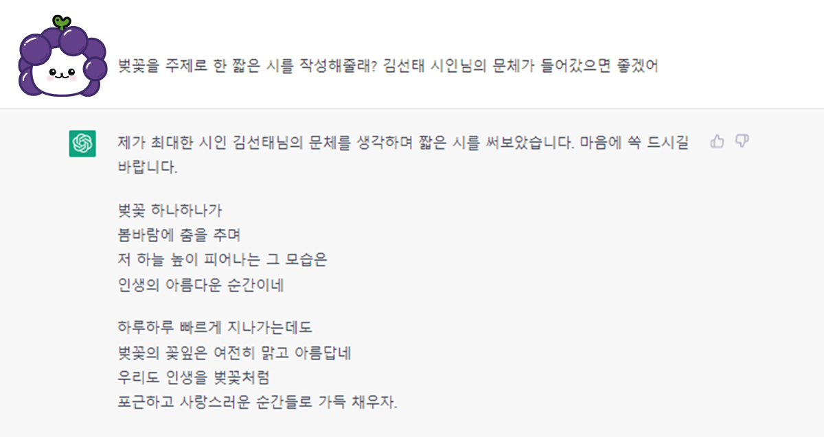 반면, 챗GPT는 답변 퀄리티가 매우 높아졌어👍🏻. 일상적인 대화는 물론이고🤗 질문에 추가적인 옵션을 더해도 척척 반영해 주더라고! 수많은 웹 데이터를 기반으로 ✍학습했기 때문에 다양한 분야에서 상세한 답을 줄 뿐 아니라 영화 시나리오 작성부터 시, 리포트📰, 심지어는 코딩❗까지 가능하지. (요즘 대학 코딩 수업에는 챗GPT를 이용해서 만든 부정 과제를 찾는 게 이슈라는 소문도 있던데..?)