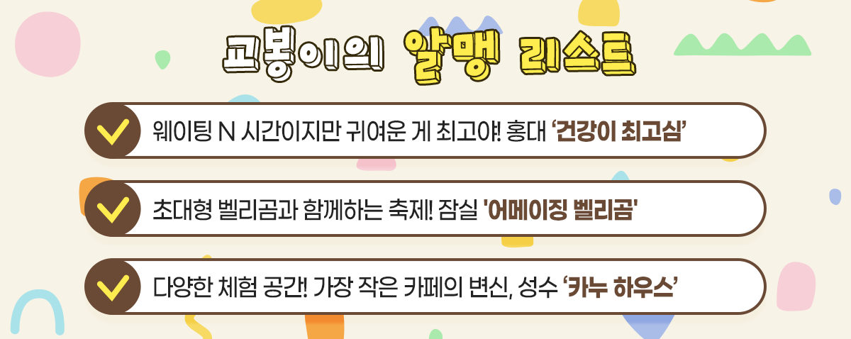 친구들 꽃놀이🌸는 잘 다녀왔어? 요즘 봄꽃도 만개💐하고 바람🌬도 살랑 부는 게 걷기 딱 좋은 날씨인 것 같아. 봄의 절정 4월인 만큼 집에만 있을 수 없겠지? 이번에는 교봉이가 트렌드의 성지! 힙하고 핫한🔥 팝업스토어를 소개해주려 해. 볼거리, 놀거리는 물론 인증샷까지 겟할 수 있는 팝업스토어로 골랐으니 모두 함께 핫플의 성지로 떠나보자고~🤩