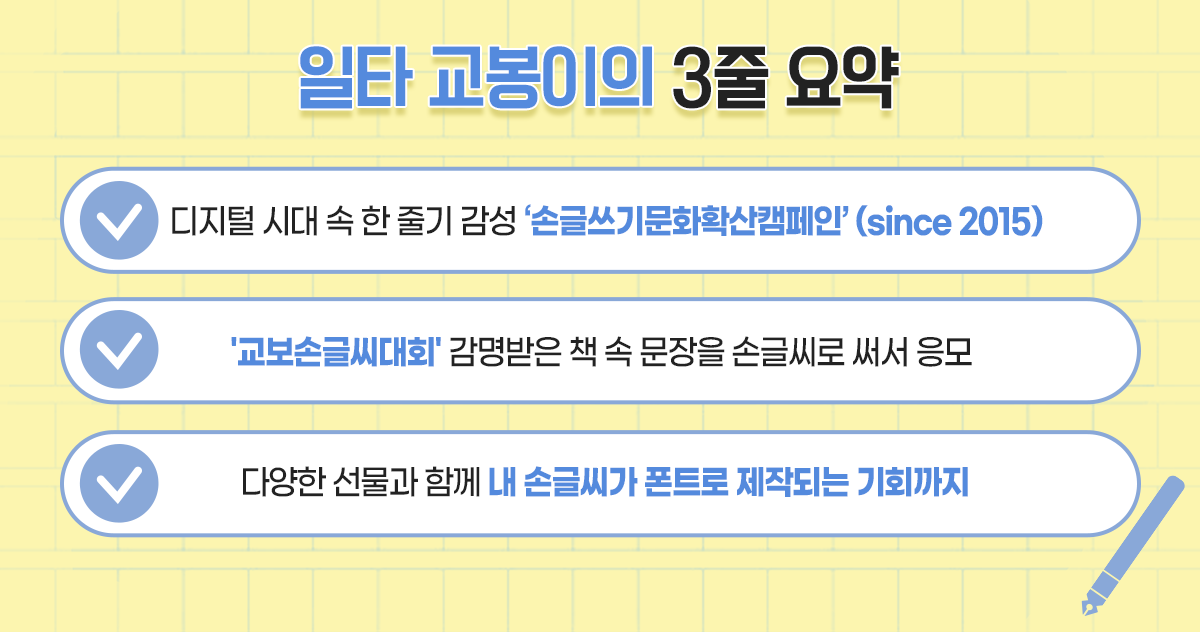 그런데! 국민서점 교보문고가 2015년부터 손글씨문화확산을 위해 두 팔 걷어붙이며 나서고 있다는 사실! 우리 손글씨를 뽐낼 수 있는 이색 대회까지 개최하고 있다고 하는데, 지금부터 교봉이와 함께 살펴보자!