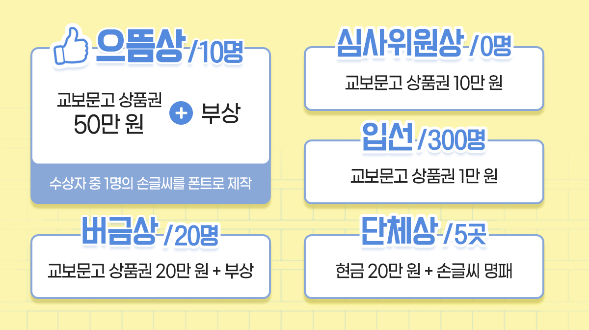 수상자에게는 각종 🎁부상이 준비돼 있고, 최종 심사작으로 선정된 30명의 손글씨는 교보문고 광화문점에서 🖼전시도 될 예정이야.