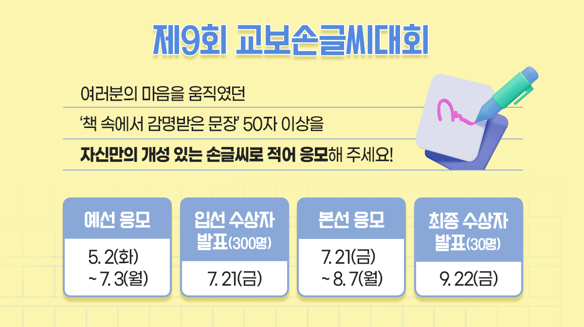 올해 ‘제9회 교보손글씨대회’는 지난 2일에 시작돼 7월 3일까지 예선 응모를 받고 있어! 예선 기간이 지나면 300명의 입선 수상자를 선정해 부상을 증정하고, 본선 진출자에게는 우편으로 본선용 응모용지를 보내지. 본선 진출자들이 다시 한번 써 준 손글씨로 본선 심사를 진행해서 최종 수상자를 선정하는 거야!