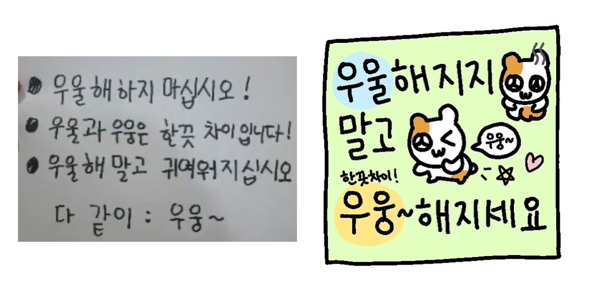 얼마 전 SNS에 해당 글이 화제가 되며 많은 친구들이 인생의 모토로 삼았다고 하지? 살다 보면 우울한 순간은 어쩔 수 없이 찾아오지만 우울과 우웅은 한 끗 차이! 이왕이면 귀여워지자🥰!