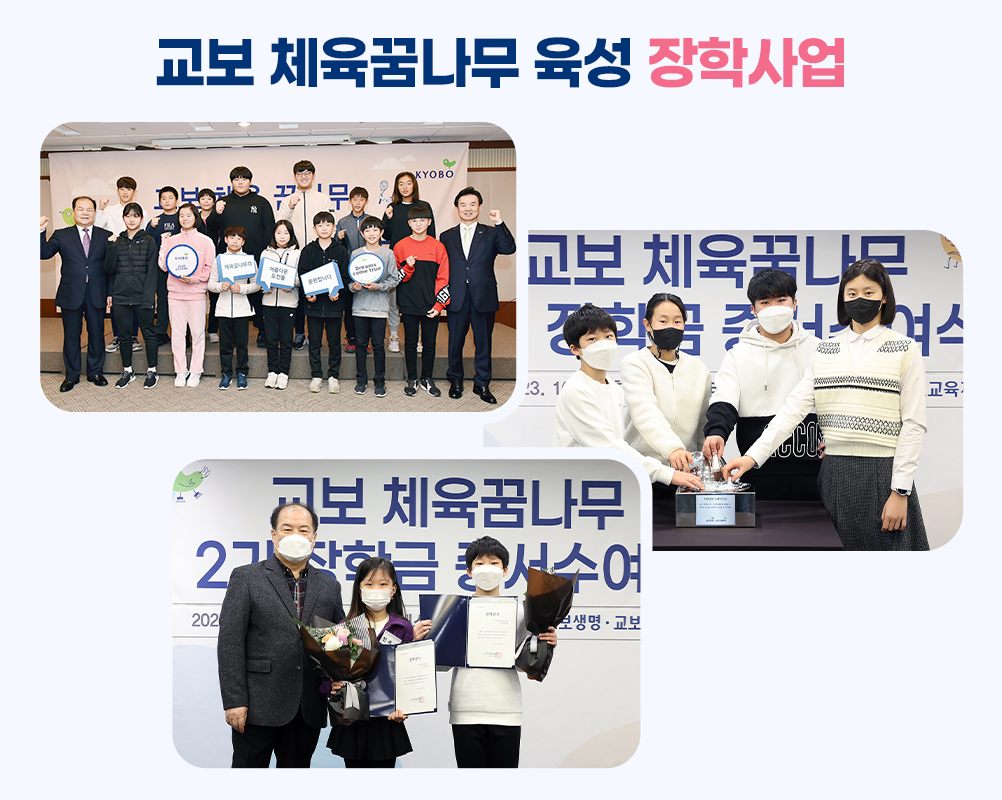 교보생명은 단순히 체육대회 개최에서 끝나는 것이 아니라 🙌교보생명컵에서 발굴한 체육꿈나무 선수들을 장학생으로 선발해 물심양면으로 지원하고 있어. 2019년에 ‘교보 체육꿈나무 육성 장학사업’을 시작해 선발된 1기 장학생들에게 장학금은 물론이고 심리상담, 재활치료 등 다양한 지원을 아끼지 않았지. 작년에는 코로나19로 3년 만에 열린 대회에서 2기 장학생이 선발돼 올해 다양한 프로그램에 참여하며 성장하고 있어.