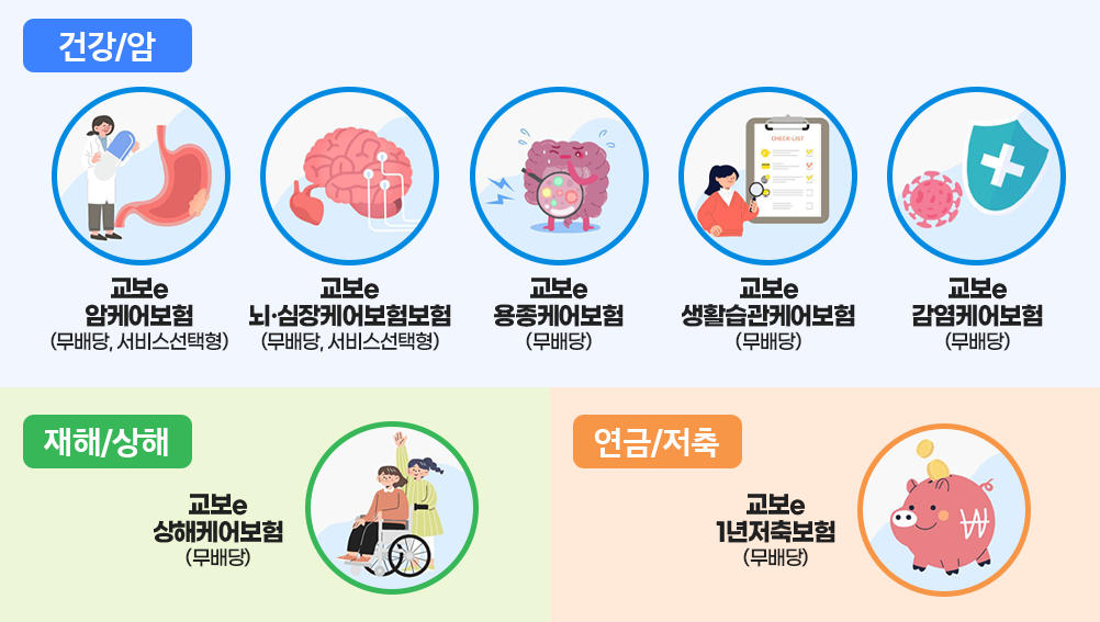 교보생명은 이번에 모바일 보험 가입자들을 위해 간편하게 가입할 수 있는 e보험 상품 7가지를 출시했어. 📌암, 용종, 뇌·심장, 생활습관, 감염, 상해 등 다양한 영역에 대한 케어 보험과 1년 만기의 저축보험까지, 언제 발생할지 모를 일상생활 속 위험에 대해 필요한 보장만 쏙쏙 골라 가입할 수 있는 미니보험들이야.