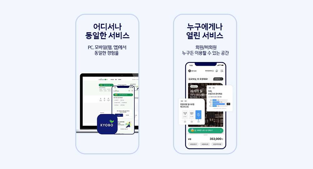 교보생명은 무엇보다 📍고객중심 가치 제공에 주목적을 두고 디지털 혁신을 통한 편의성 개선에 역량을 집중해왔어. PC와 모바일을 통해 모든 이용 고객들이 금융 및 비금융 서비스를 편리하게 이용할 수 있도록 데이터 체계를 마련하고, 오픈뱅킹과 금융마이데이터를 연계한 차별화된 서비스를 지속적으로 선보이고 있지.
