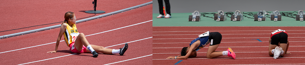 올라오는 근육통에도 스타트 총성에 언제 아팠냐는 듯 전력을 다해 달리는 친구들! 결승선을 지나서야 가쁜 숨을 뱉어내며 트랙 위로 주저앉았는데. 그 열정과 투혼은 그 어떤 프로 선수들과 견주어도 절대 뒤지지 않았어!