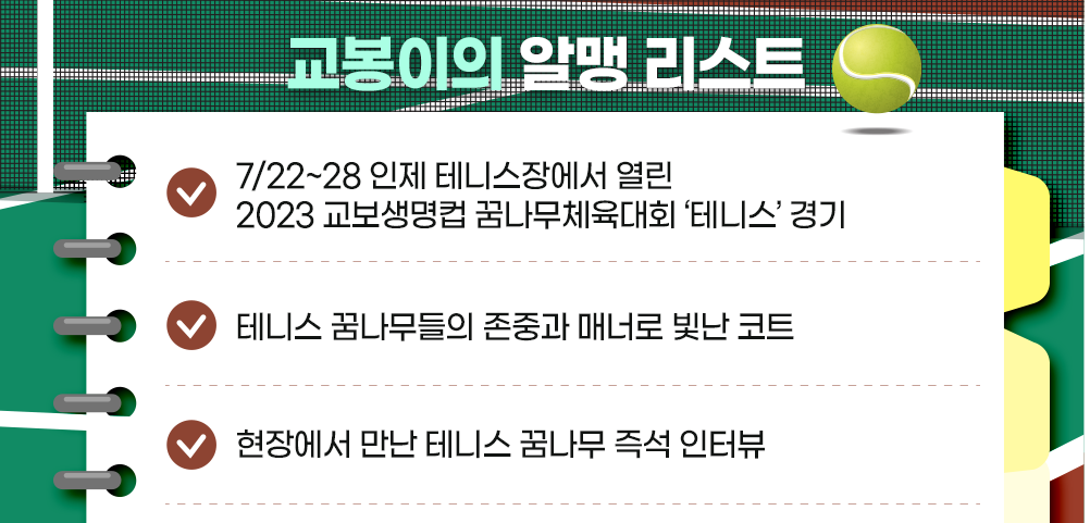 친구들! 지난번에 육상 경기로 2023 교보생명컵 꿈나무체육대회가 힘찬 출발을 알렸던 거 기억하지? 이어진 다음 종목은 바로 테니스🎾!