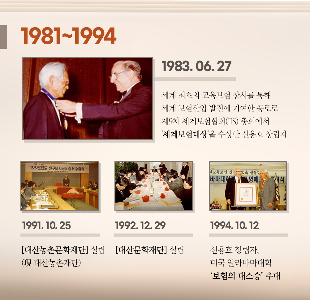 “교육을 통한 인재 양성이 민족의 미래”라는 일념으로 모든 사업의 방향을 잡았던 신용호 선생은 1983년, 교육보험제도 창안으로 세계 보험산업 발전에 기여한 공로를 인정받아 세계보험협회(IIS)로부터 한국인 최초로 ‘세계보험대상’을 수상합니다.