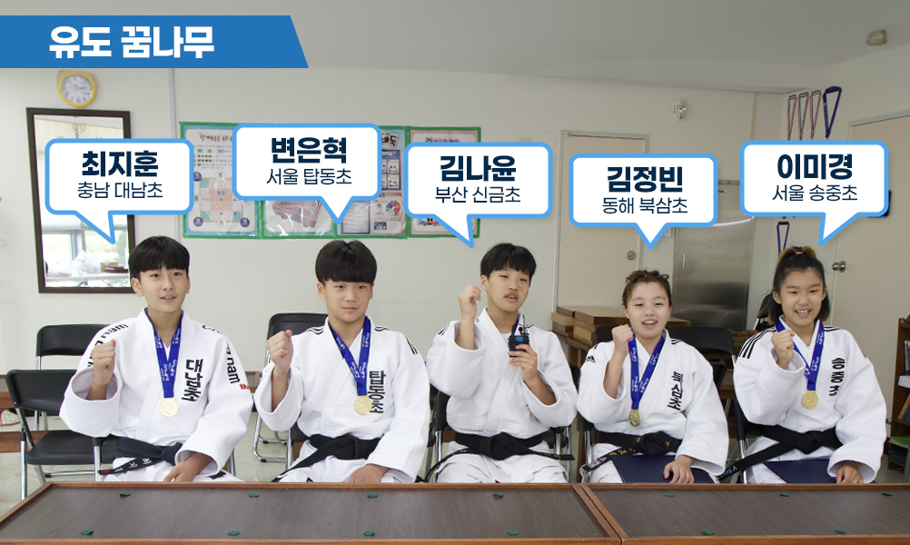 대남초 최지훈(-60kg), 탑동초 변은혁(-66kg), 신금초 김나윤(+52kg), 복삼초 김정빈(-52kg), 송중초 이미경(-48kg) 선수를 만나보자!