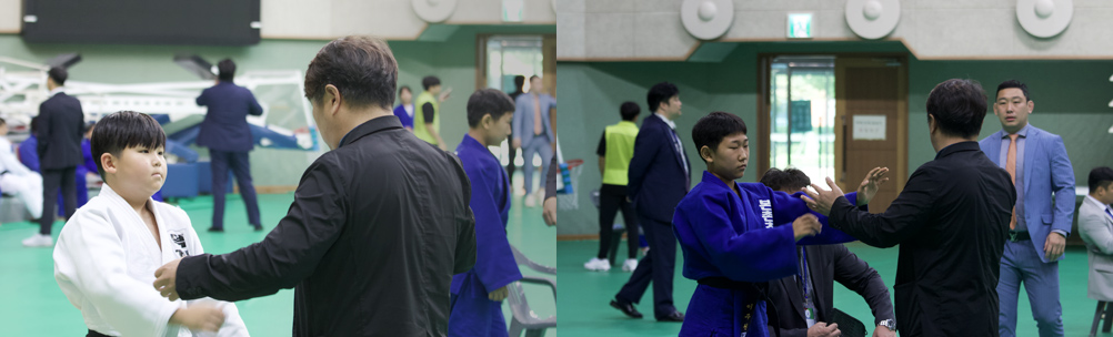 예정된 1시간의 연습 시간이 끝나고 경기장 정비를 위해 잠시 선수들이 바깥에서 대기하게 됐는데, 우리 유도 꿈나무 친구들의 열정에 장소는 중요하지 않더라구! 딱딱한 바닥의 복도에서도 서로의 자세를 봐주고 기술을 도와주는 등 연습을 이어가는 모습이었어.