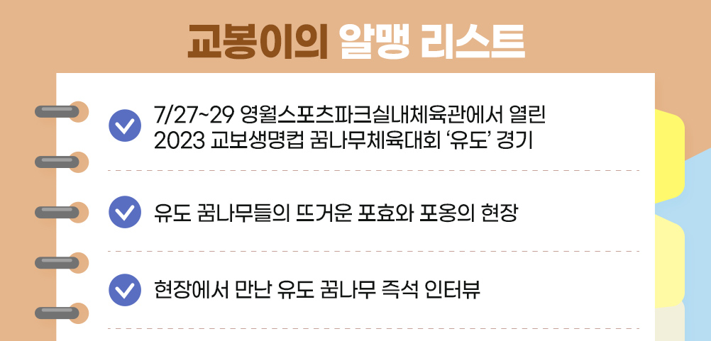 그럼 2023 교보생명컵 꿈나무체육대회 유도 소식은 여기까지! 앞으로 남은 체조, 수영, 빙상, 탁구 현장도 기대해 줘!