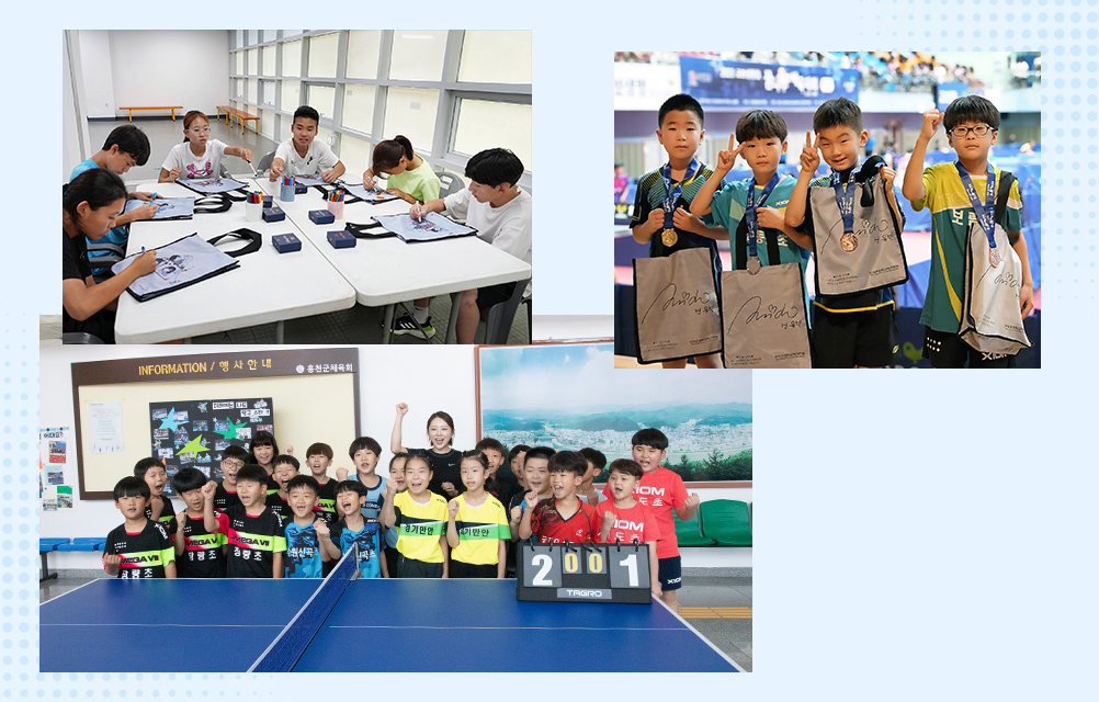 또, 탁구 대회에는 유승민 IOC 위원장과 서효영 전 국가대표 선수가 깜짝 방문해 꿈나무 선수들을 응원하고 탁구를 이용한 이벤트도 함께하며 꿈같은 시간을 보냈어.🤗 가방에 그려진 롤모델 선수의 사인만으로도 잔뜩 설레고 신난 표정의 체육 꿈나무 선수들이었는데. 평소 존경하던 선수를 직접 만나는 기회까지! 교보생명은 모든 체육꿈나무 선수들이 축제처럼 즐길 수 있는 대회를 위해 끊임없이 노력하고 있어!
