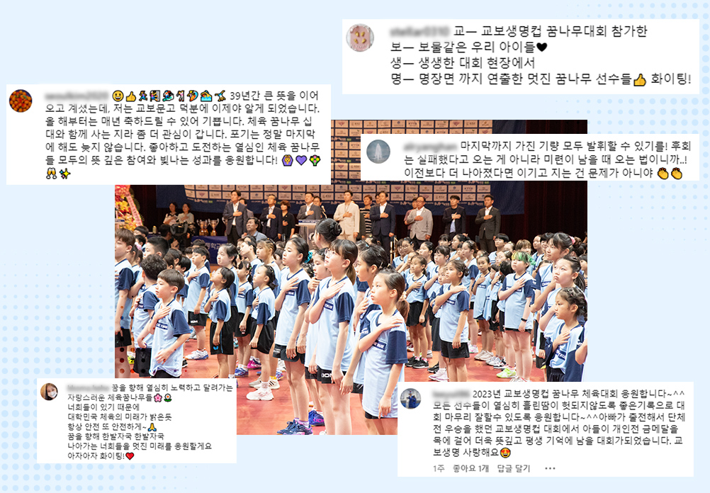 그리고 체육꿈나무 선수들이 끝까지 멋진 경기를 치를 수 있었던 데는 많은 사람들의 관심과 응원이 있었기 때문이 아닐까 싶은데. 글쎄 대회 기간 중에 교보생명컵 꿈나무체육대회 인스타그램에 무려 1,431개의 응원 댓글이 달렸어💌