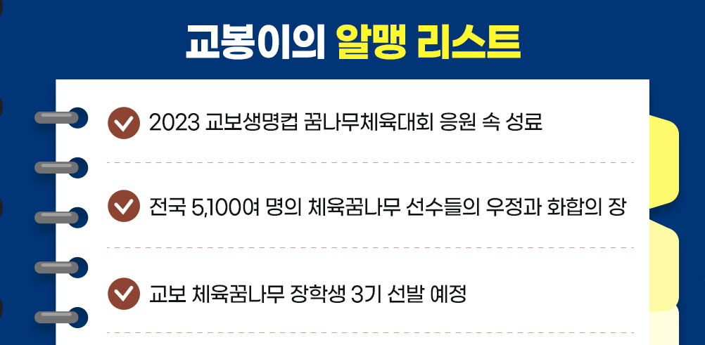 지금까지 교봉이랑 같이 각 종목 대회 현장도 모두 만나봤는데. 오늘은 아직 다 소개하지 못한 2023 교보생명컵 꿈나무체육대회의 이야기를 준비해봤어.😘