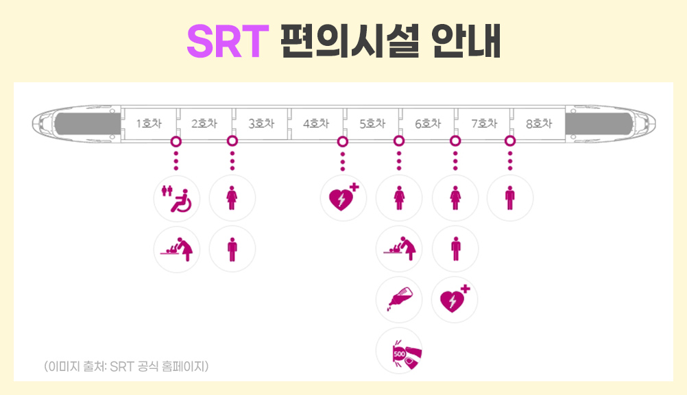 SRT는 열차 1대당 8개 객실이 있어. 열차마다 🧑🦽장애인 화장실, 휠체어 보관소, 👩🍼수유실, 기저귀 교환대, ❤️AED(자동제세동기), 자판기 등 편의시설을 구비하고 있어. 🛅물품보관소와 소화기는 모든 객실 사이에 있고 열차 내 와이파이는 물론, 각 좌석마다 🔌콘센트도 마련되어 있어!