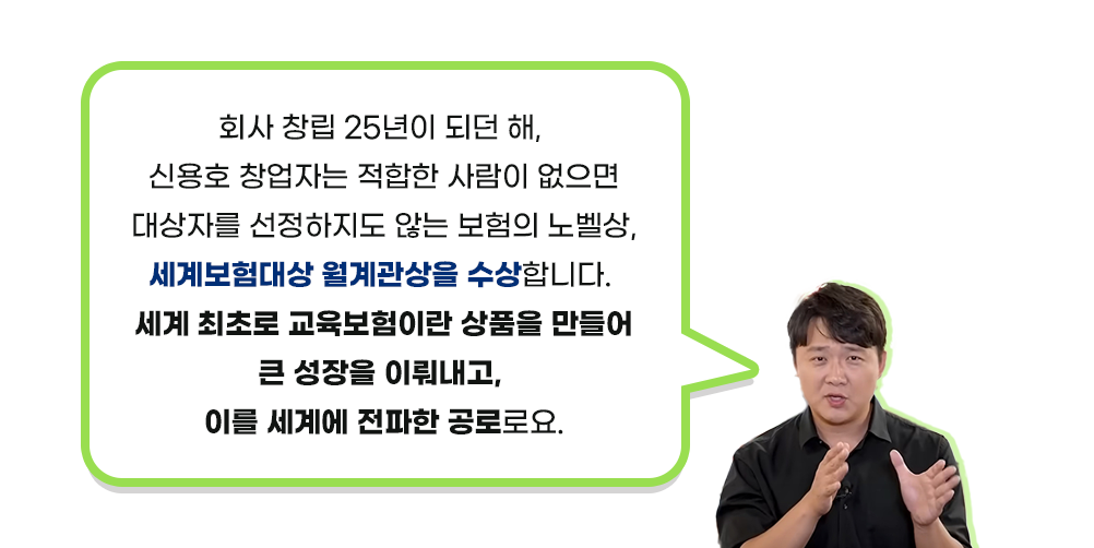 이후로도 여러 번의 사업 실패를 거듭한 끝에 신용호 창립자는 결국 해답을 ‘교육’에서 찾습니다. ‘배우지 못해서 한이 많은, 자식의 교육을 위해서라면 뭐든지 하는’ 한국 사람들을 보며, 보험상품을 통해 학자금 마련을 돕겠다는 생각을 하게 됩니다.