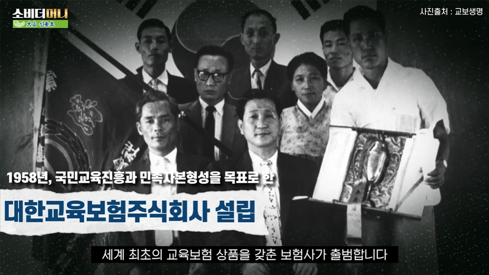 마침내 1958년, '국민교육진흥'과 '민족자본형성'을 목표로 '대한교육보험주식회사'가 출범했는데요. 이때 출시한 '진학보험'이 세계 최초의 교육보험 상품으로 기록돼 있습니다. 1995년, '교육보험'을 줄여서 '교보생명보험'으로 사명을 바꿔 지금에 이르렀죠.