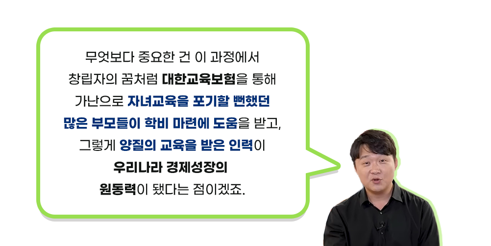 이후로도 여러 번의 사업 실패를 거듭한 끝에 신용호 창립자는 결국 해답을 ‘교육’에서 찾습니다. ‘배우지 못해서 한이 많은, 자식의 교육을 위해서라면 뭐든지 하는’ 한국 사람들을 보며, 보험상품을 통해 학자금 마련을 돕겠다는 생각을 하게 됩니다.