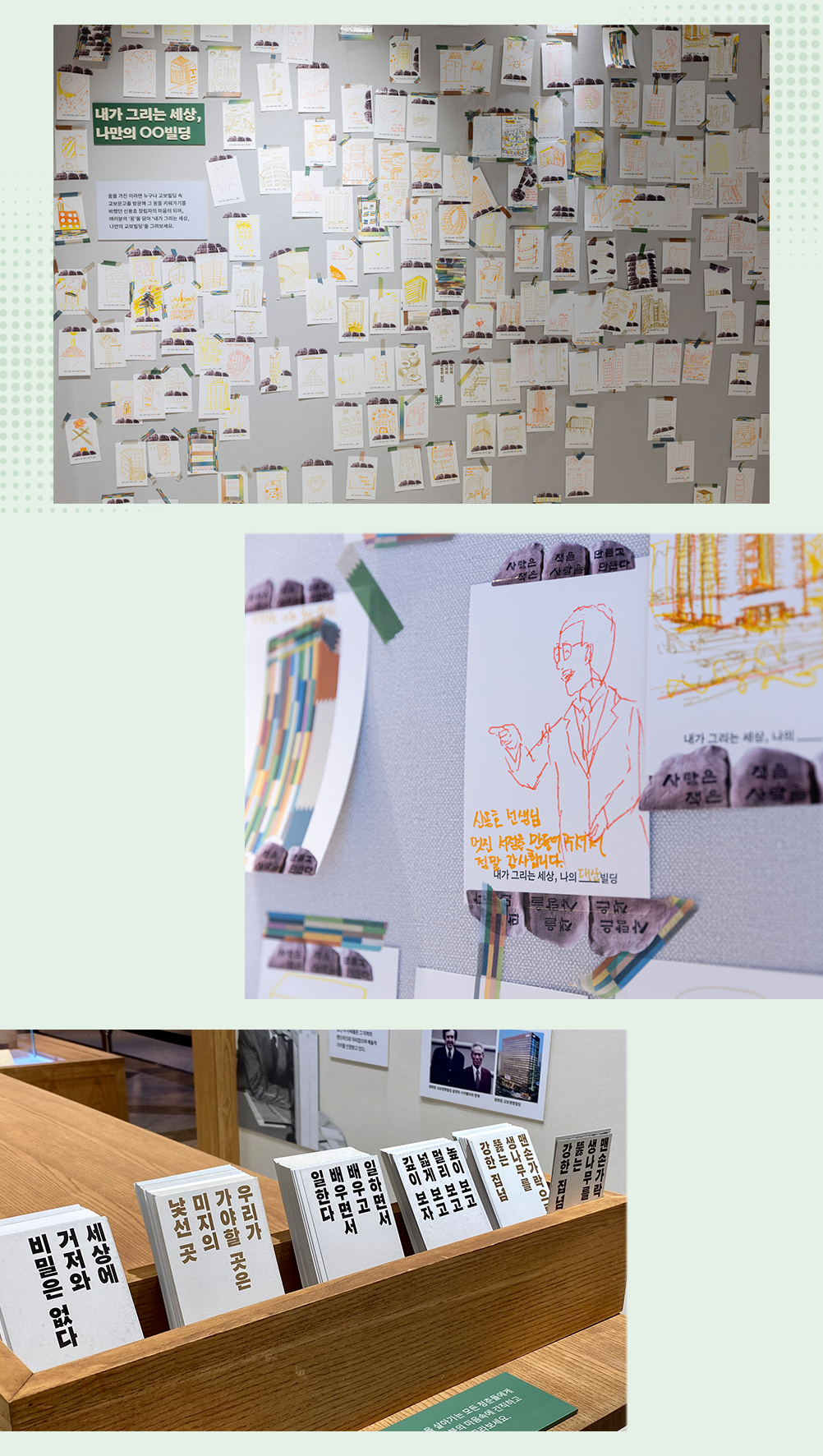 대산은 꿈을 가진 사람이라면 누구나 교보빌딩의 교보문고에 와서 그 꿈을 키워가기를 바랐다고 하는데, 그 마음이 잘 전해졌는지 전시가 시작된 지 일주일 만에 벌써 방문객들의 꿈의 빌딩 그림으로 벽이 가득 채워져 있었어!❤