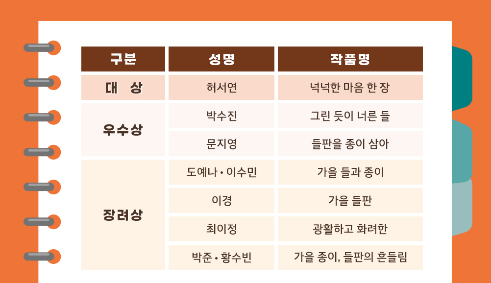 쟁쟁한 후보들을 제치고 대상 💓을 받은 작품은 친구들도 이미 많이 봤지? 이번 광화문글판 가을편을 장식하고 있는 허서연 학생의 ‘넉넉한 마음 한 장’이야. 추수를 끝낸 농부 👩🌾의 마음을 창의성 있게 표현하여 심사위원들의 호평을 받았지.