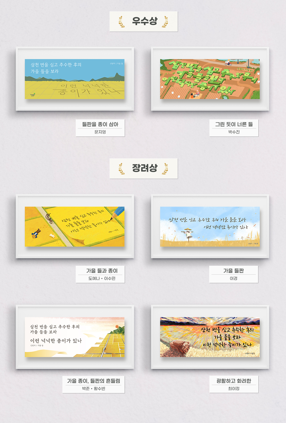 수상작으로 공개되는 작품은 광화문글판 가을편으로 게시된 대상 작품 하나였지만, 다양한 아이디어로 심사위원과 전문가들에게 감동을 준 다른 수상 작품도 많이 있어. 대상 외에도 우수상 2팀, 장려상 4팀에 상이 수여됐지 🌟.