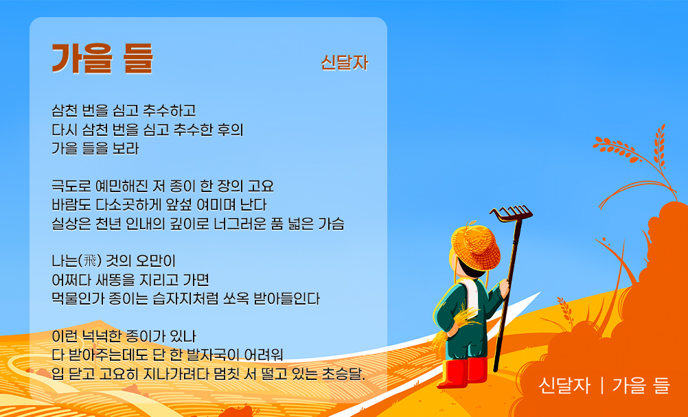 봄과 여름의 노력을 거두는 추수의 계절은, 풍성함을 자랑하는 한편 수확을 끝난 뒤 텅 빈 모습 또한 보여주죠. 얼핏 쓸쓸해 보일 수 있는 가을 들을 오히려 긍정적으로 바라본 이가 있습니다. 바로 신달자 시인입니다.