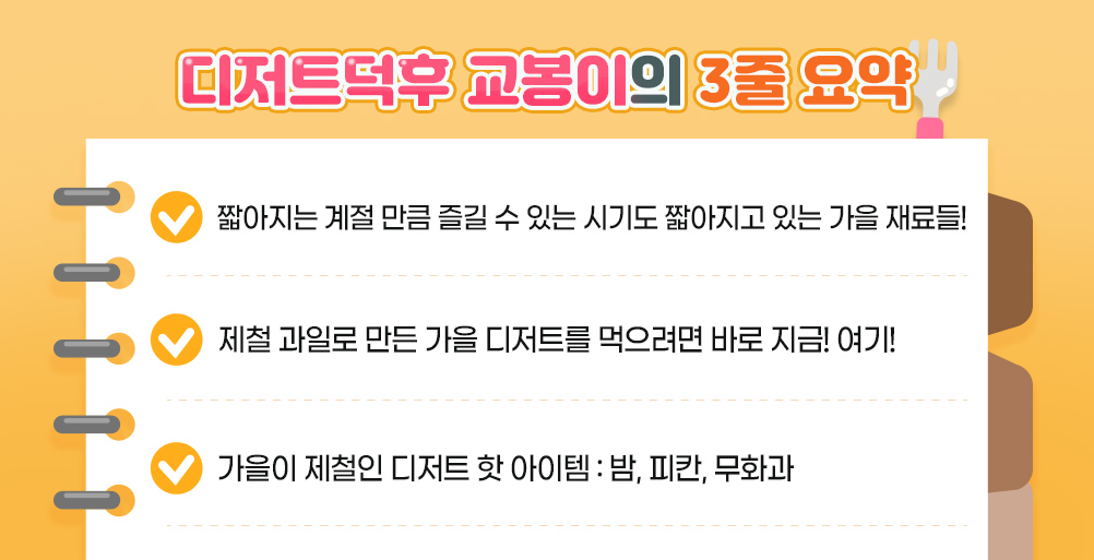 디저트 덕후들 안녕~!🧁 여기 모인 디저트 덕후들은 ‘밥 배’와 ‘디저트 배’가 따로 있으신 분들 맞지? 제철 과일은 못 챙겨 먹어도🍎 제철 디저트는 챙겨 먹어야 하는 친구들을 위해 교봉이가 직접 뽑은 ‘가을 디저트 베스트3’를 소개하려고 해🍰. 다들 입맛 다실 준비됐지?