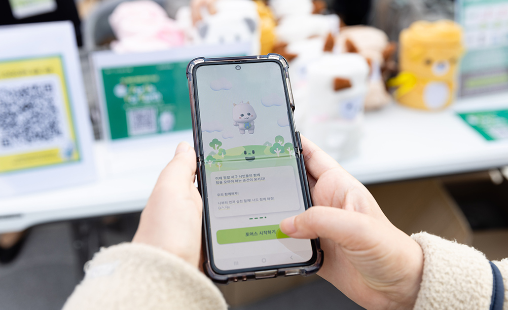 이번 지구하다 페스티벌 체험 부스🎪 중 가장 기억에 남는 곳은 역시 A 존이라 할 수 있어👏. 일상생활에서 8가지 환경 보호 실천을 돕는 ‘포어스’ 앱을📱 설치할 수 있었거든. 교봉이는 매일 포어스 앱에 들어가 환경 보호 활동에🌳 참여하고 인증하고 있어.