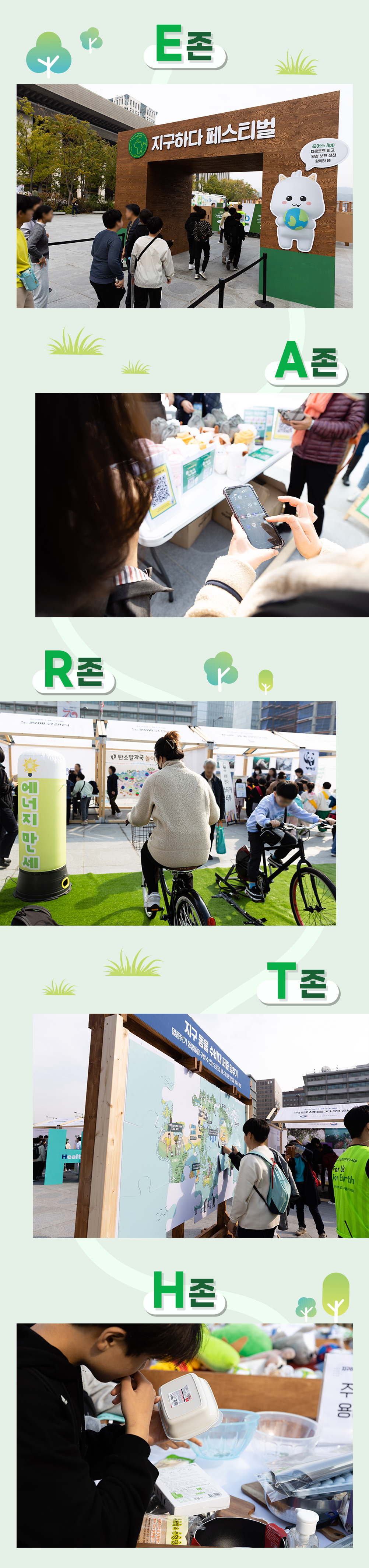 체험 부스는🎪 E, A, R, T, H의 5개 존으로 구성돼 있었는데, 사람들이 환경 보호의 중요성을🍀 쉽게 이해할 수 있도록 재미있는 콘텐츠가 준비돼 있었어.