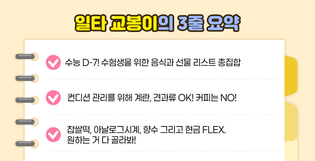 교봉이가 고민에 사로잡힌 친구들을 위해 수능 D-7 필요 리스트를 준비해 봤어📄! 수험생들에게는 컨디션 조절을 위해 필요한 음식 리스트를🍽, 수험생에게 선물을 하고 싶은 친구들에게는 센스만점 칭찬 들을 수 있는 선물 리스트를 말이지👏! 그럼 교봉이만 믿고 따라오라구!