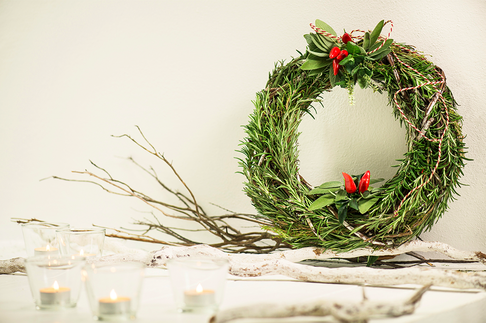 걸어 놓는 것도 마땅치 않으면 식탁에 올려놓는 것도 좋은 방법이야😻. 동그란 리스를 걸지 않고 식탁에 올려놓은 다음, 그 안에 다양한 소품을 넣는 거지😆. 앞서 소개한 캔들을 리스 안에 넣는 것도 좋겠다🕯!