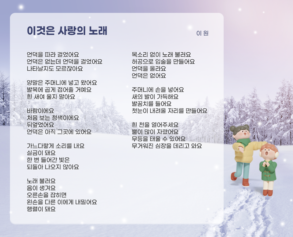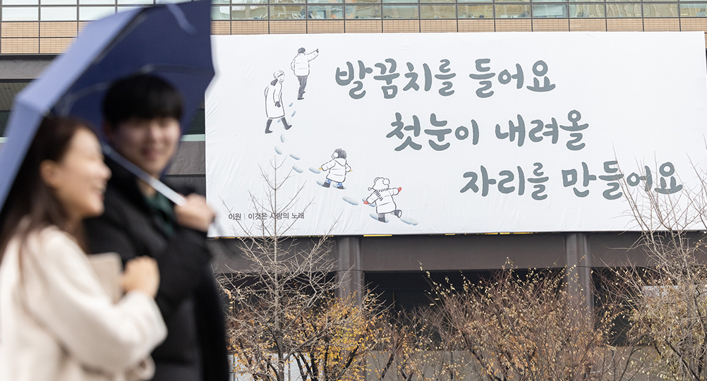 특히 사랑하는 사람들과 함께 하는 연말인 만큼, 사랑의 의미를 되새길 수 있는 따스한 문안이 2023 광화문글판 겨울편을 장식했는데요. 이원 시인의 <이것은 사랑의 노래>, 함께 만나보겠습니다.
