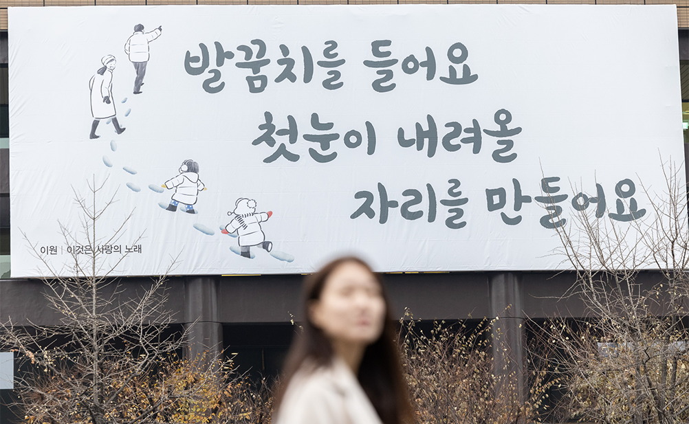 이원 시인: 발꿈치를 드는 사소한 동작은 간절한 동작이기도 하고, 천진난만한 동작이기도 하고, 희망을 부르는 동작이기도 합니다. 글판을 보실 때마다 한 번씩 발꿈치를 들어 첫눈을 기다리는 시간을 자주 만나시면 좋을 것 같아요.